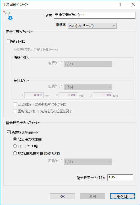 [ホーム]タブ > [プローブパス]パネル > [リンク] > [干渉回避パラメーター]をクリックして、[干渉回避パラメーター]ダイアログを表示します。
