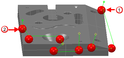 次図の CAD モデルは、2 つのサーフェス検査グループのコンタクトポイントを示しています。