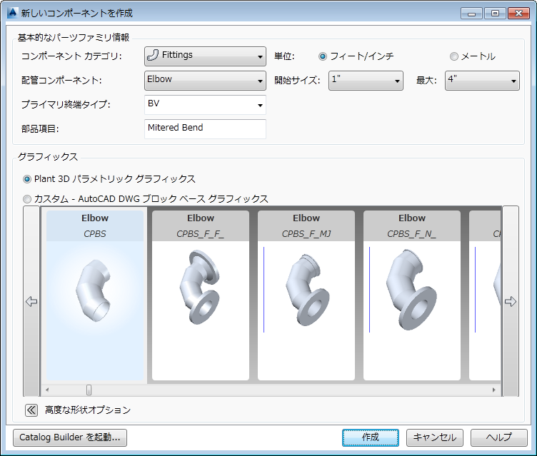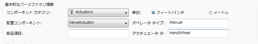 [配管コンポーネント]と[グラフィックス]は、コンポーネントの作成後には変更できません。追加プロパティは、パーツを作成した後で、[カタログ エディタ]タブで修正できます。