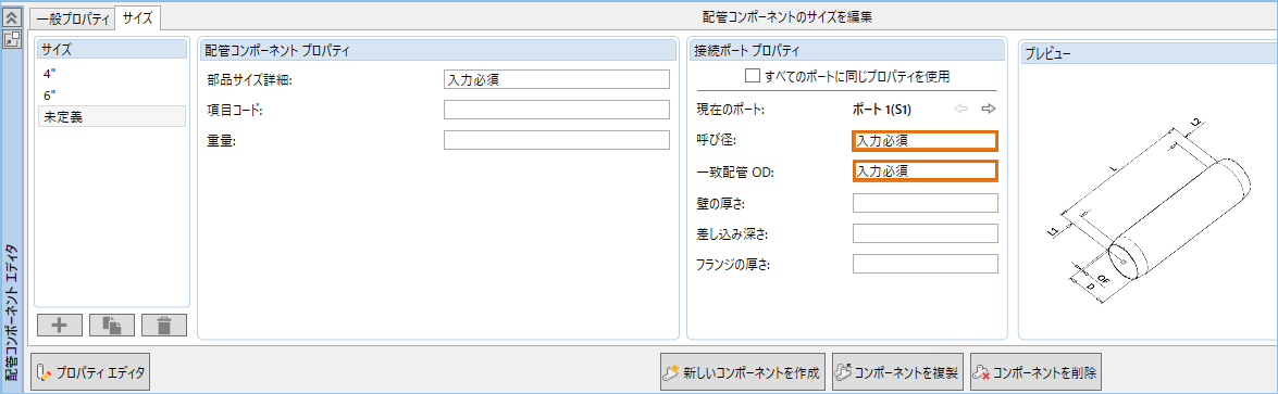 コンポーネントの接続ポート プロパティを指定します。部品仕様や重量などのサイズに依存するプロパティを指定します。