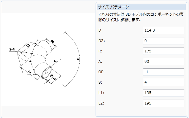 一部のパラメータは、他のパラメータから計算するように設定できます。たとえば、エルボのベンド半径(R)の値がゼロの場合は、ベンドを直径の半分(D / 2.0)に設定することを示します。