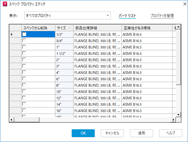選択したパーツ ファミリ内のパーツを、スペック シートに含めるために編集します。