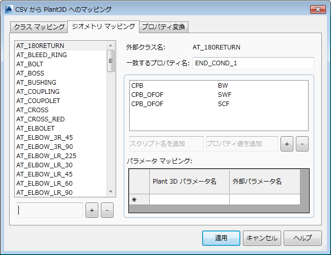 Plant 3D とサードパーティの間のパラメータ マッピングを指定します。各ジオメトリ マッピングには対応するパラメータ セットがあり、これらは形状に応じて異なる場合があります。