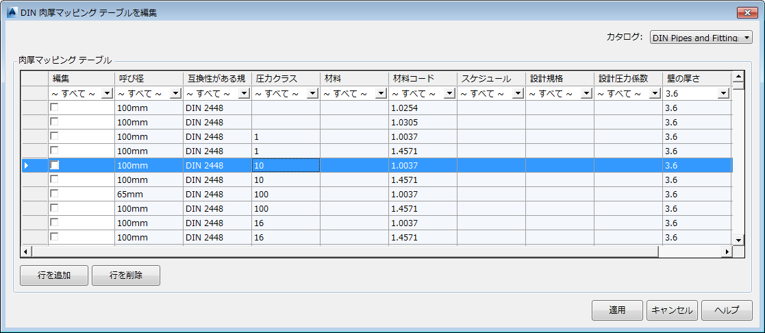 DIN 肉厚マッピング テーブルのオプションを編集します。