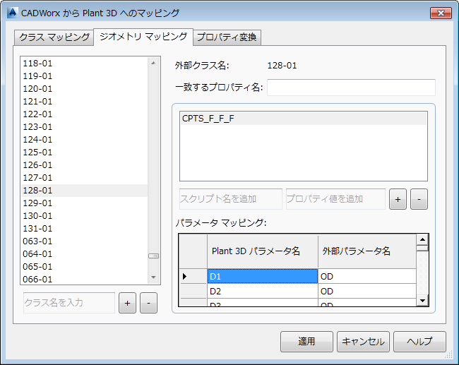 Plant 3D と CADWorx の間のパラメータ マッピングを指定します。各ジオメトリ マッピングには対応するパラメータ セットがあり、これらは形状に応じて異なる場合があります。