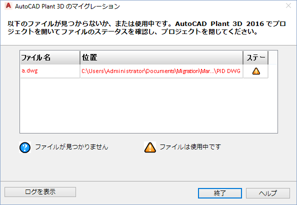 プロジェクトと関連する図面が使用可能になるか、ロックされるまで、AutoCAD Plant 3D toolset へのマイグレーションを処理することはできません。
