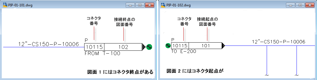 オフページ コネクタは、元の図面と接続先の図面というペアで使用されます。他図面へ継続するラインの終端には、[終了] コネクタが必要です。2 番目の図面に含まれる同じラインには、[開始] コネクタが必要です。どちらも同じシンボルによって表され、連続性を識別するためにコネクタ番号も同じです。