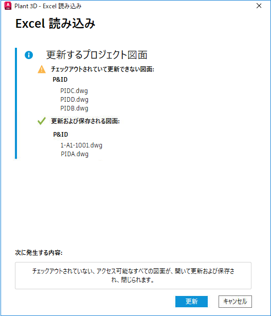 [Excel 読み込み]ダイアログ ボックスには読み込みの進行状況と、影響を受ける図面がチェック アウトされるか、更新できない場合の情報が表示されます。[更新]をクリックして、影響を受けるすべての図面をチェック アウトし、Excel からデータ マネージャにデータを読み込み、影響を受ける図面を更新します。