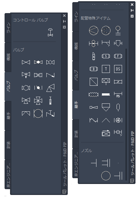 バルブやレデューサなどのインライン コンポーネントは、配管上に配置されます。