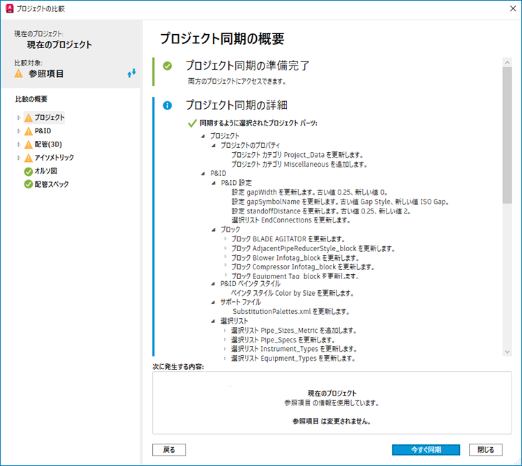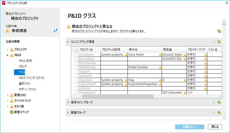 [プロジェクトの比較]では、プロジェクト間で異なるプロジェクト設定を更新および同期する対象を選択できます。クラスの 1 つのプロパティを同期したり、プロジェクトの大部分を同期することができます。
