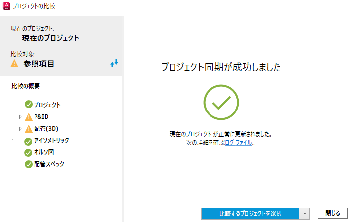 のアイコンはプロジェクト パーツに相違点が見つかった場合に表示されます。比較するプロジェクトを切り替えるには、