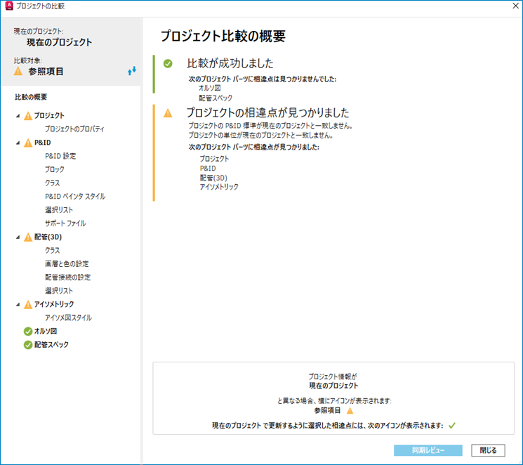 [プロジェクトの比較]ダイアログ ボックスの左ペインに、比較したプロジェクトの概要が表示されます。