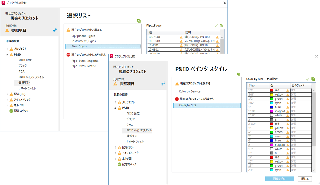 プロジェクト設定の相違点を確認することができます。一致している情報はグレーの文字で表示されます。プロジェクト間の相違点は黒い文字で表示され、黄色の警告アイコンが付いています。