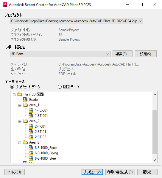 - [データ ソース]で、必要に応じて[プロジェクト データ]または[図面データ]をクリックします。[図面データ]をクリックした場合は、レポートの対象にする 1 つまたは複数の図面も選択する必要があります。