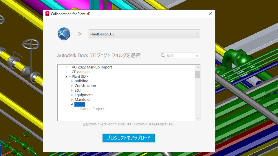 Autodesk Docs のサブフォルダ内のプロジェクトでコラボレーションできるようになりました。この機能は、Plant プロジェクトをクラウドで共有する場合に特に便利です。