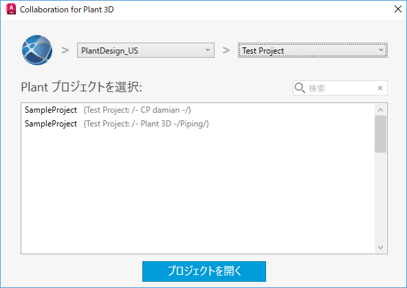 コラボレーション プロジェクトを開くときに、必要なアクセス権限がある場合は、Autodesk Docs アカウントから Plant プロジェクトを選択することができます。