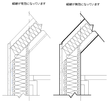 細線ツールを有効にすると、線をどれだけ拡大ズームしても、線は細い状態を維持します。これにより、線が隣接する場合により明瞭で詳細な表示が可能になり、選択が容易になります。プロジェクト内の線に与える影響を確認するには、次の例を参照してください。
