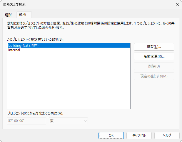 - [場所]ダイアログ ボックスの[敷地]タブで、新しい座標系を選択し、[現在の値にする]をクリックします。