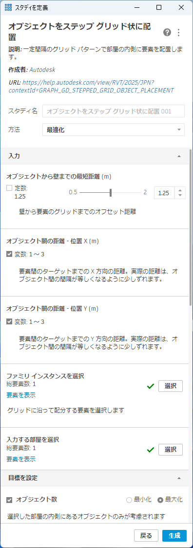 ステップ グリッド状のスタディでは、部屋要素と、部屋に配置するファミリ インスタンスを使用します。このケースでは、テーブル、椅子、および物理的距離の要件を示す破線で構成されるネストされたファミリを使用します。X 軸および Y 軸方向の、オブジェクト(テーブル)間の距離の変数を選択します。間隔を設定すると、グリッド、およびファミリの挿入点(基準点)に基づいてファミリ要素の配置が決まります。