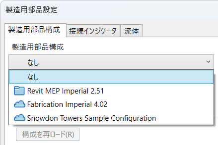現在のモデルで使用している部品種別を、いずれかの Autodesk Fabrication 製品ライン(CADmep、ESTmep、CAMduct)の製造用部品構成で修正したものに更新するには、[構成を再ロード]をクリックします。