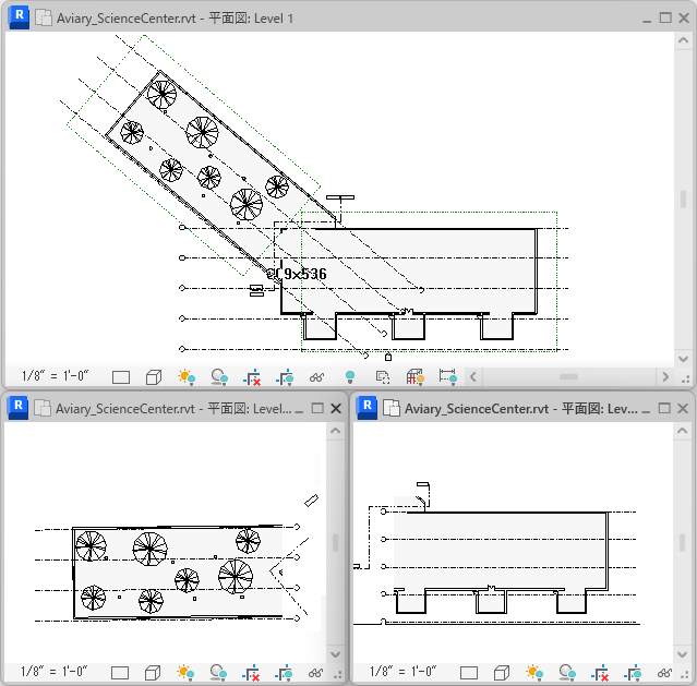 たとえば、次の図の最上部のビューでは、本館と鳥類飼育棟の周囲にスコープ ボックスが表示されています。スコープ ボックス 1 は本館の通芯に適用され、スコープ ボックス 2 は鳥類飼育棟の通芯に適用されました。この結果、従属ビュー(下)には建物の各部分に適用される通芯のみが表示されます。
