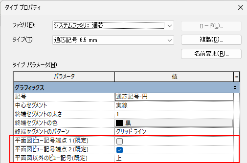 • 立面図や断面図など、平面図ビュー以外のビューでは、通芯記号を表示する位置を指定します。[平面図以外のビュー記号(既定)]で、[上]、[下]、[両方](上と下)、[なし]のいずれかを選択します。