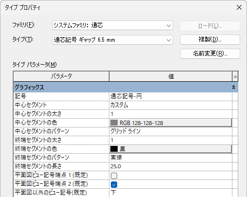 - 端部セグメントとは異なる線の色、太さ、パターンを使用して、通芯の中心セグメントを表示します。([通芯記号カスタム ギャップ]通芯タイプを変更するか、ユーザ独自のタイプを作成します)。