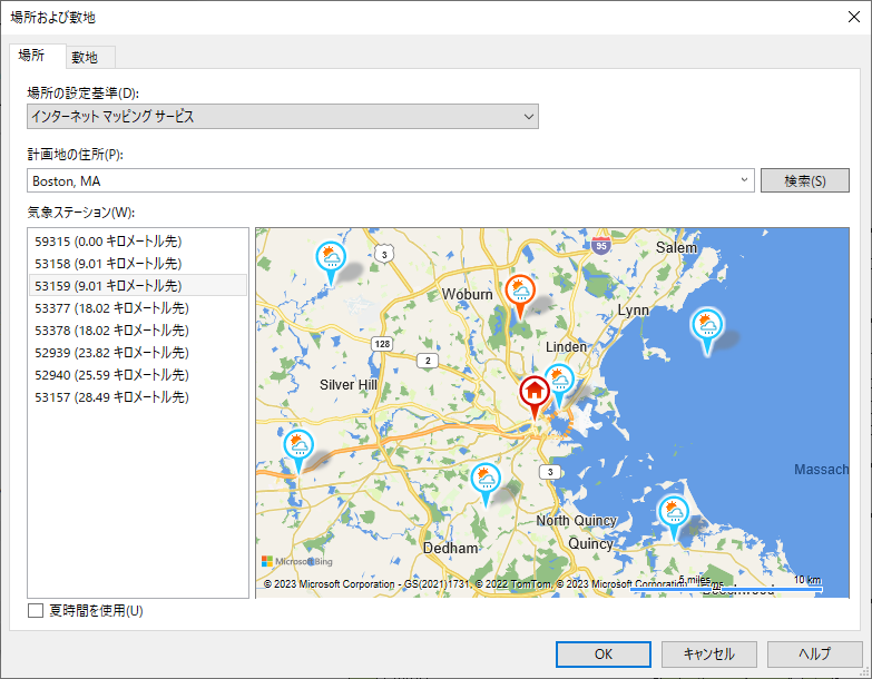 マップ内および左側のリストに使用可能な気象ステーションが表示されます。一般的には、現在地に最も近い気象ステーションを選択します。ただし、標高や風土条件などにおいてモデルの位置をよりよく反映している付近の気象ステーションから選択することもできます。