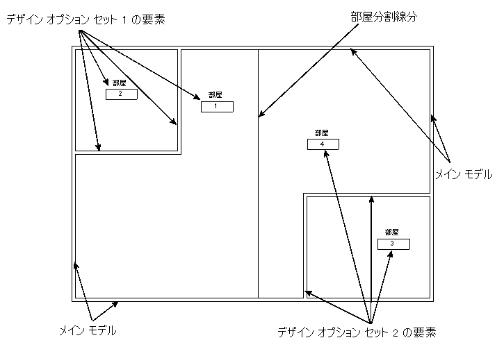 異なるオプション間で部屋の形状、サイズまたは場所が同じで、部屋に割り当てるプロパティもすべてのオプション間で同じ場合は、部屋をメイン モデル内に置きます。