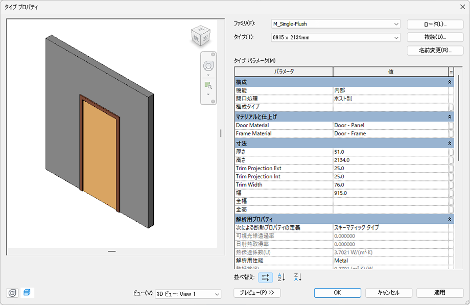 次に示す例は、ドア タイプの[タイプ プロパティ]ダイアログで、[プレビュー]ペインが表示されています。