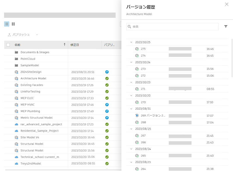 [バージョン履歴]の浮動パネルを使用して、検索およびフィルタができます。モデルは日付別にグループ化されます。