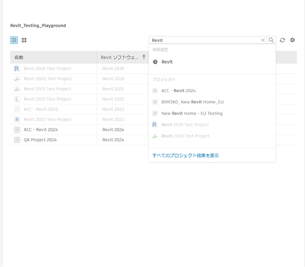 すべての Revit バージョンのプロジェクトを表示する表示機能があります。現在実行中の Revit バージョン以外のバージョンのプロジェクトは、無効状態として表示されます。この機能はオンとオフの切り替えができます。この機能をオンにするには、[オプション]ダイアログ