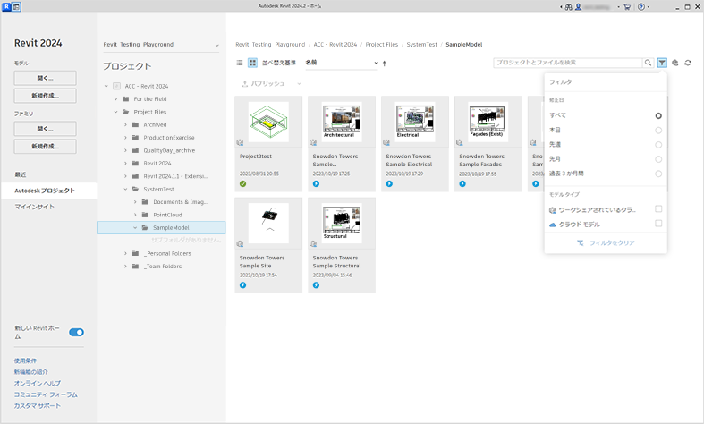 - プロジェクトとファイルを検索し、更新日(すべて、今日、先週、先月、過去 3 ヵ月)とタイプ(ファミリとモデル)でフィルタします。