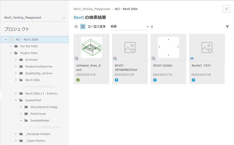 - 使用可能なグリッド ビューとリスト ビュー。グリッド ビュー プロジェクトには、クラウド モデルのサムネイル、各モデル タイプのアイコン(ワークシェアされているもの、されていないもの)、パブリッシュ ステータスがアイコンとともに表示されます。
