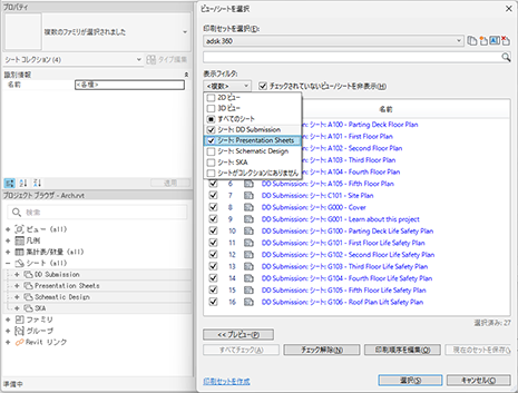 パラメータのシート コレクションおよび参照シート コレクションは、既存のシートおよびビュー パラメータとともに Revit の互換性のあるビュー タイプに使用できます。