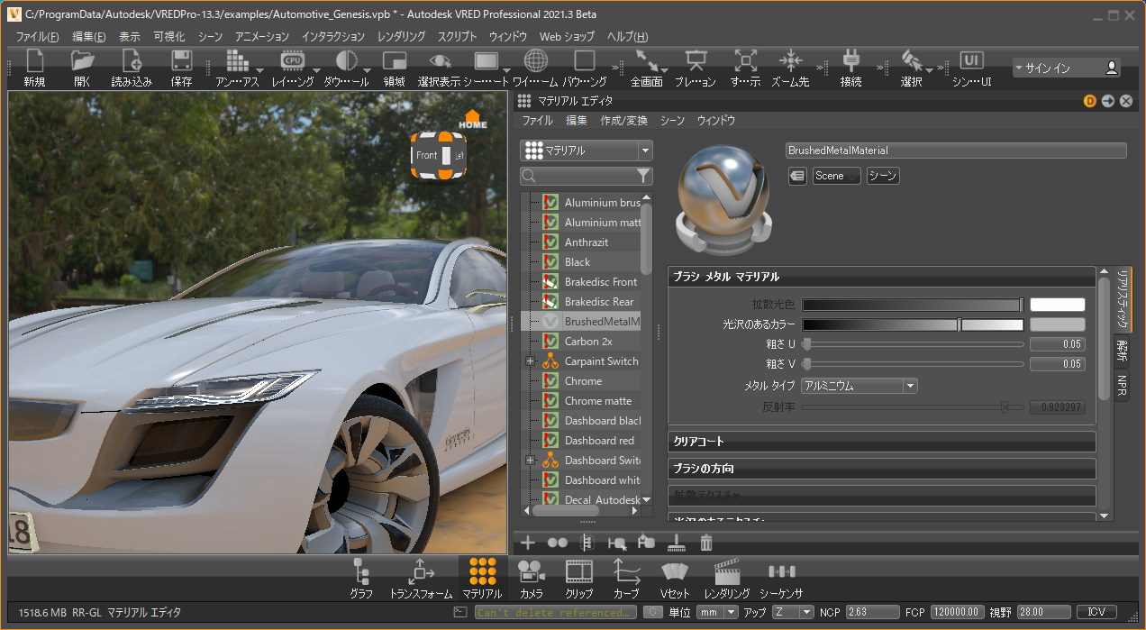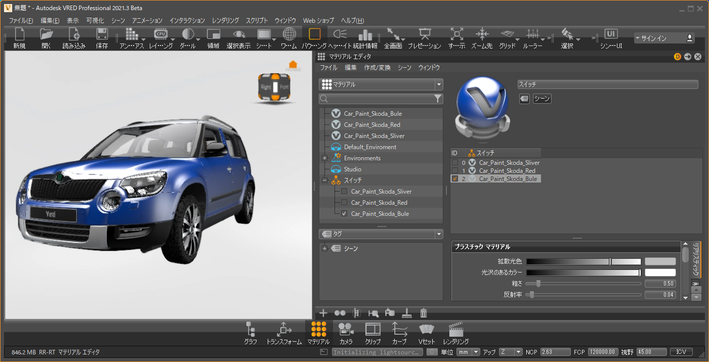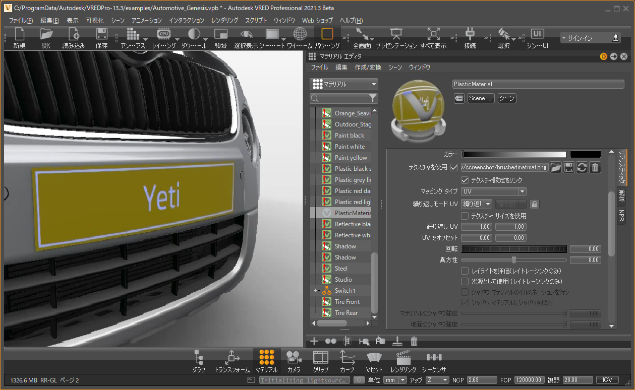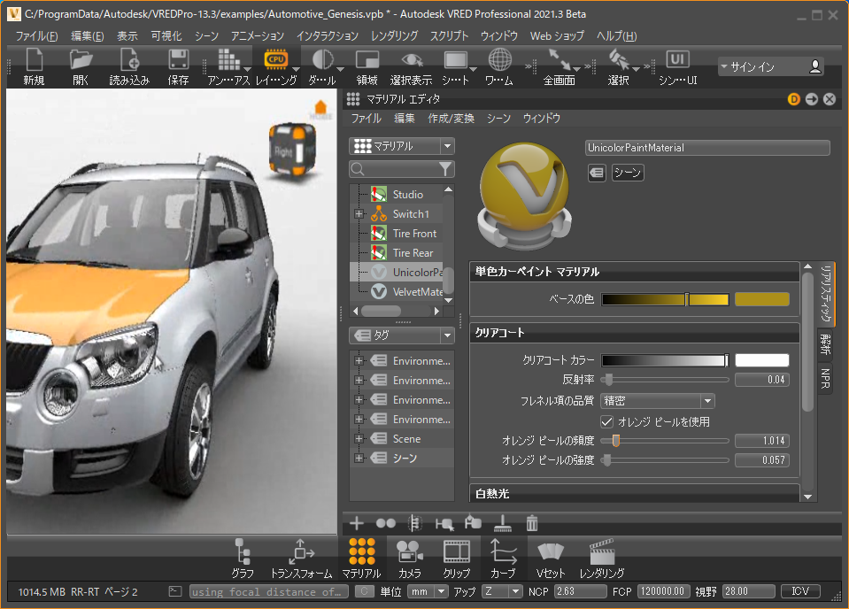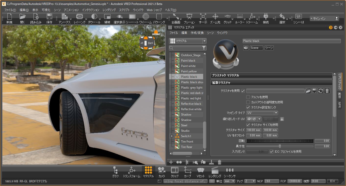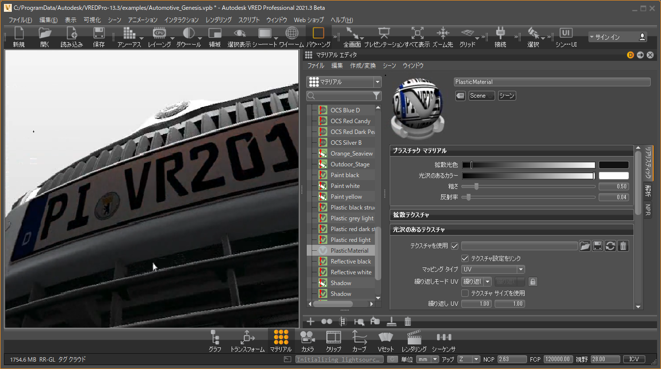 VRED マテリアルおよびマテリアル ツールのリファレンス情報については、「リファレンス」の「 マテリアル 」のセクションおよび「リファレンス」の「 環境 」のセクションを参照してください。