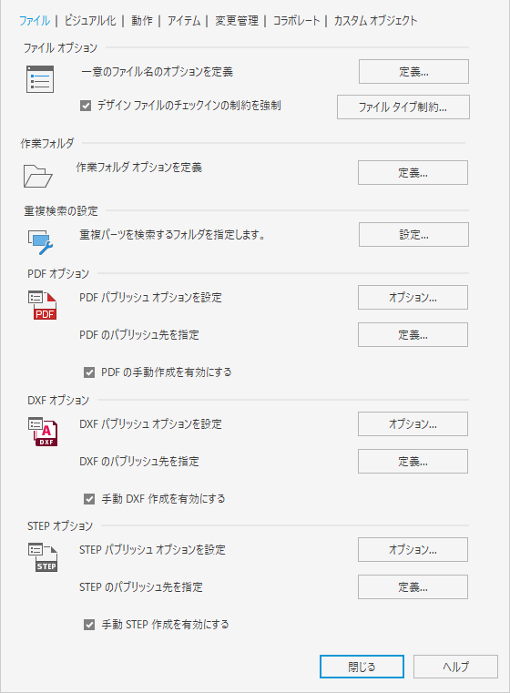 注: PDF、DXF、STEP ファイルのパブリッシュは、Vault Professional でのみ使用できます。