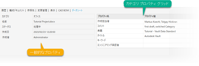 一般プロパティのグリッドには、ダイアログ定義ファイルに保存される Vault プロパティにバインドされた静的定義、ラベル、およびコンテンツ コントロールがあります。ダイナミック グリッドは、エンティティ(ファイル、フォルダ、カスタム オブジェクト)カテゴリの選択を通じてラベルと値フィールドを自動的に追加する空のグリッド オブジェクトです。これらの 2 つのグリッドは、[データシートを作成/編集](Create/Edit Datasheets)(前の図を参照)および[詳細]タブのデータシートのコア要素です。