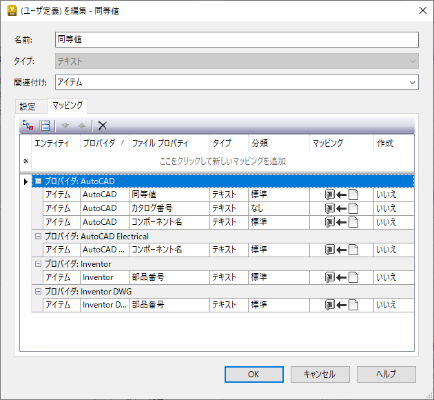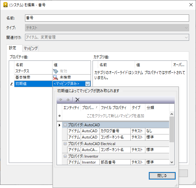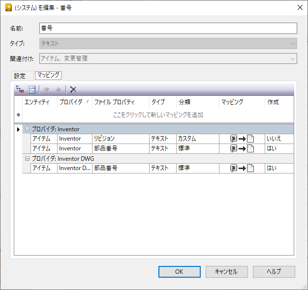 - 図に示すように、番号の[マッピング]タブを選択して、(アイテム)番号のプロパティを AutoCAD Mechanical にマッピングします。