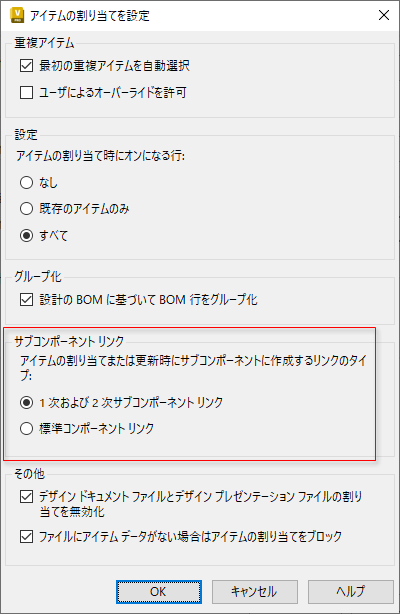 [アイテムを割り当て]または[アイテムを更新]イベントで使用される 1 次、2 次、または標準のコンポーネント リンクを設定して、サブコンポーネントのリンク タイプをコントロールします。