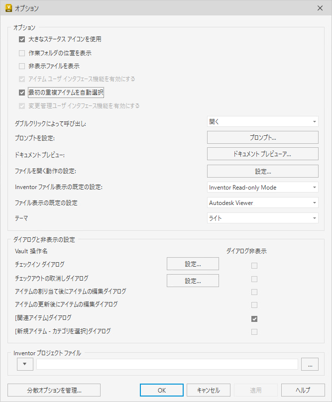 [ダブルクリックによって呼び出し]の設定では、ファイルをダブルクリックした場合の既定の動作を指定します。Vault 内のファイルをダブルクリックした場合、既定のアクションは [ウィンドウに表示]になります。既定のアクションとして[開く]を選択した場合、ファイルは Vault からチェックアウトされ、編集用に関連付けられているアプリケーションで開きます。既定のアクションを変更するには、ドロップダウン リストからアクションを選択します。注: Inventor の.dwg ファイルを編集する場合、Inventor でファイルが開きます。Inventor をインストールしていない場合は、AutoCAD で .dwg ファイルが開きます。