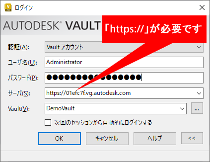 ゲートウェイへのログインは、直接サーバ接続を介して Vault にログインするのと同じ手順で行います。[サーバ]フィールドには、サーバ名ではなく、ゲートウェイへの HTTPS URL (管理者がゲートウェイを管理するときに表示されるゲートウェイのホスト名)を入力します。