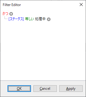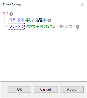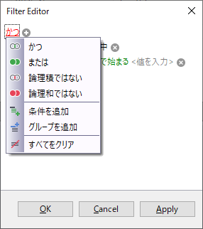 [フィルタ エディタ]ダイアログ ボックスで、赤で表示された演算子(既定では AND)の横にある「+」ボタンを選択します。