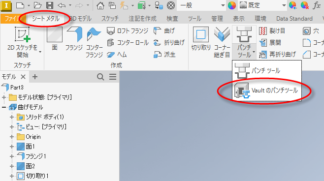 Inventor の[シート メタル]タブに、新しい[Vault のパンチツール]コマンドが追加されました。これにより、Vault から 3D iFeature 形状を参照して、シート メタルの面に挿入することができます。