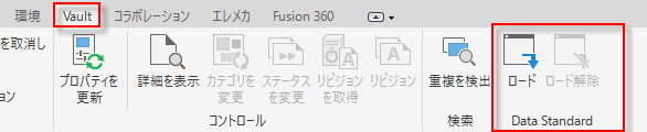 Autodesk Inventor で、Data Standard アドインを有効または無効にするには、Vault リボンの[ロード]ボタンまたは[ロード解除]ボタンを使用します。