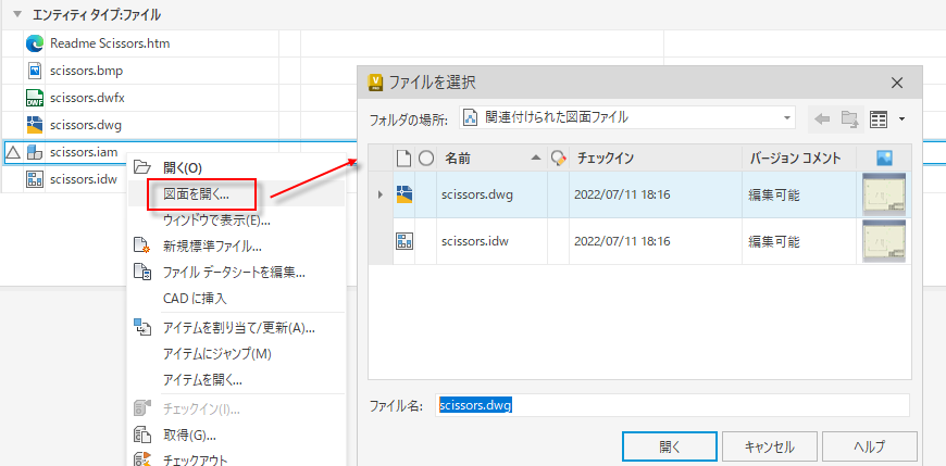 ファイルのコンテキスト メニューで、新しく追加された[図面を開く]コマンドを使用して、関連付けられた図面ファイルを Vault Client から開きます。