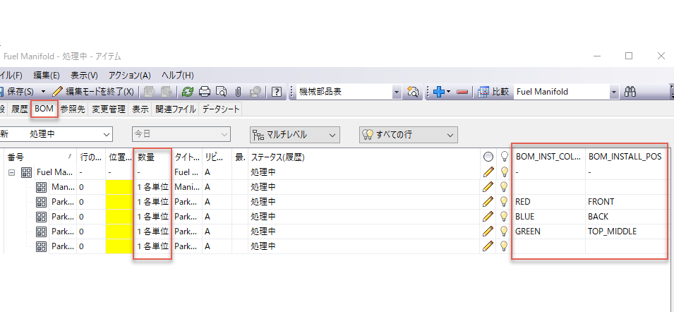 インスタンス プロパティは、Vault 部品表(BOM)内のアイテム プロパティと同じように動作します。同じ部品番号のアイテムは、インスタンス プロパティ値によってグループ化されます。インスタンス プロパティが存在しない場合、BOM は旧リリースと同様に動作します。