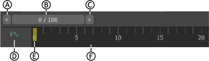 시간 슬라이더 및 트랙 바: A. 백업 시간의 한 단위,B. 시간 슬라이더, C. 전달 시간의 한 단위, D. 미니 곡선 편집기 열기, E. 현재 프레임 표시기, F. 타임라인
