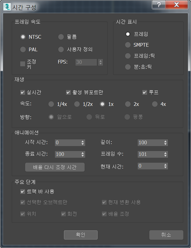 시간 슬라이더와 3ds Max 전체에 시간을 표시하는 방법(프레임, SMPTE, 프레임 및 틱 또는 분, 초 및 틱)을 지정합니다.
