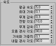 예를 들어 평균 속도의 기본값이 5.0, 최대 가속이 0.1이면 임의의 순간에서 가속 또는 감속이 0.5 단위/프레임/프레임보다 클 수 없습니다.